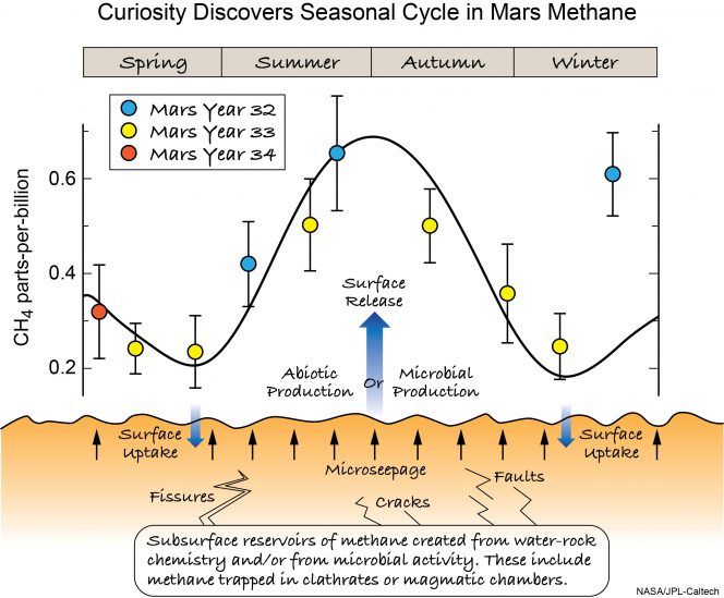 I ricercatori hanno analizzato tre anni marziani (55 mesi terrestri) di misure atmosferiche effettuate con lo strumento Tunable Laser Spectrometer del Sample Analysis at Mars (Sam) a bordo del rover Curiosity. I dati rivelano che i livelli di metano di fondo seguono, sul Pianeta Rosso, un netto ciclo stagionale, oscillando tra 0,24 e 0,65 parti per miliardo, con un picco sul finire dell’estate nell’emisfero settentrionale (e sul finire dell’inverno nell’emisfero australe). Gli autori hanno suggerito, in ultima analisi, che grandi quantità di gas possano essere immagazzinate nel freddo sottosuolo marziano all’interno di cristalli a base di acqua chiamati clatrati. Le fluttuazioni nel rilascio del metano in superficie, suggeriscono gli scienziati, sarebbero dovute cambiamenti stagionali di temperatura.