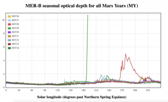 Il grafico mette a confronto l’opacità atmosferica in diversi anni marziani dal punto di vista di Opportunity. Il picco verde del 2018 (Mars Year 34) mostra quanto rapidamente la tempesta globale di sabbia che si è formata su Marte ha cancellato il cielo. Una precedente tempesta nel 2007 (in rosso, MY 28) si formò più lentamente. L’asse verticale mostra l’opacità atmosferica, quello orizzontale le stagioni marziane, misurate dalla posizione del Sole nel cielo del pianeta rosso. Crediti: Nasa/JPL-Caltech/Tamu