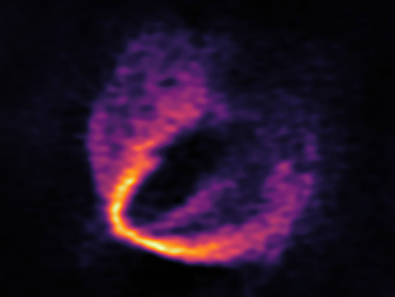 Invece che focalizzarsi sulla polvere all’interno del disco, chiaramente rappresentata nelle precedenti osservazioni di Alma, gli astronomi hanno invece studiato il monossido di carbonio (CO) gassoso diffuso nel disco. Le molecole di CO emettono luce a una caratteristica lunghezza d’onda nella banda millimetrica che Alma può osservare in dettaglio. Sottili cambiamenti nella lunghezza d’onda di questa luce, dovuti all’effetto Doppler, svelano i moti del gas all’interno del disco.