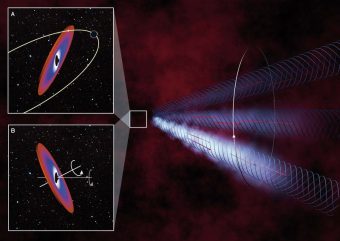 Rimangono dubbi sull’origine della precessione del getto. La precessione è un processo fisico ben noto, lo si può vedere all’opera nelle trottole o nel movimento della Terra stessa: si tratta del cambiamento della direzione dell’asse attorno al quale il corpo ruota. Infatti, l’asse di rotazione del nostro pianeta non è stabile, ma orbita nello spazio con un periodo di 26mila anni a causa dell’influenza mareale del Sole e della Luna.