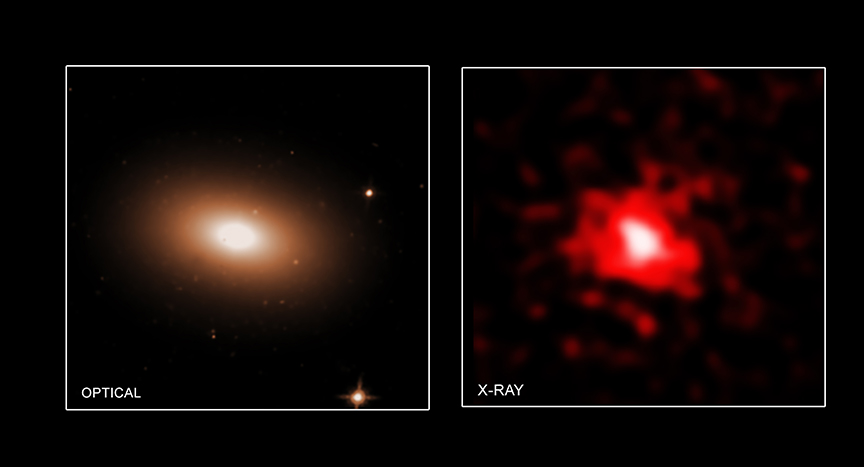Mrk 1216 vista da Hubble e da Chandra. Crediti: Nasa/Stsc (sx); Nasa/Cxc/Mta-Eötvös University/N. Werner et al. (dx)