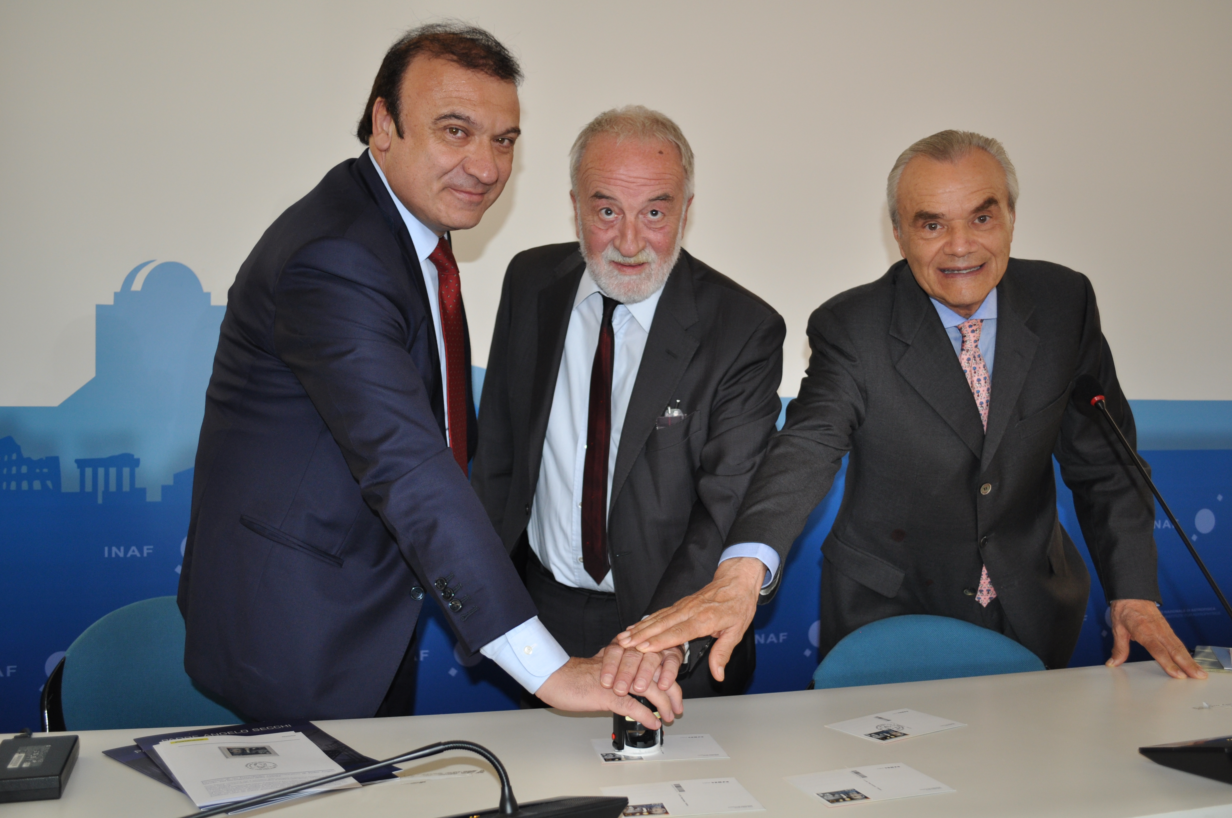 Il primo annullo del francobollo dedicato a Padre Angelo Secchi. Nella foto, al centro il presidente dell’Inaf Nichi D’Amico, a sinistra Fabio Gregori (responsabile per la filatelia di Poste Italiane) e a destra Angelo Di Stasi (presidente della Commissione per lo studio delle carte-valori postali del Ministero dello Sviluppo Economico). Crediti: Inaf