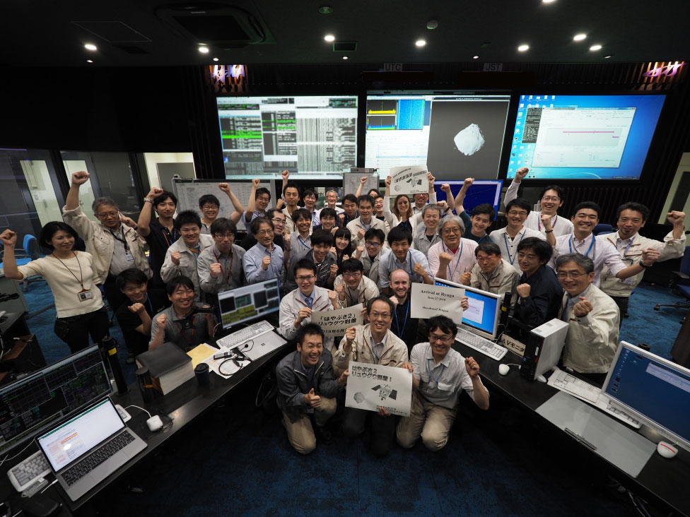 L’esultanza del team giapponese per l’arrivo si manifesta con la “posa del coraggio” (in giapponese: ガッツポーズ). Crediti: Jaxa