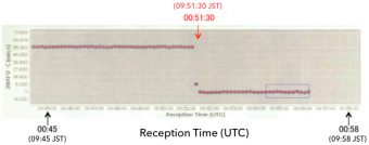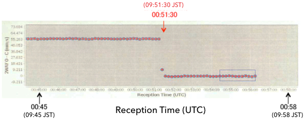 Misure Doppler del giorno di arrivo a Ryugu. L’asse verticale mostra la deviazione dal valore atteso per la velocità d’allontanamento dalla Terra della navicella. L’asse orizzontale è il tempo del 27 giugno 2018 (cliccare per ingrandire). Crediti: Jaxa