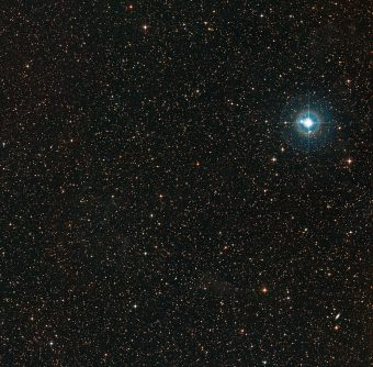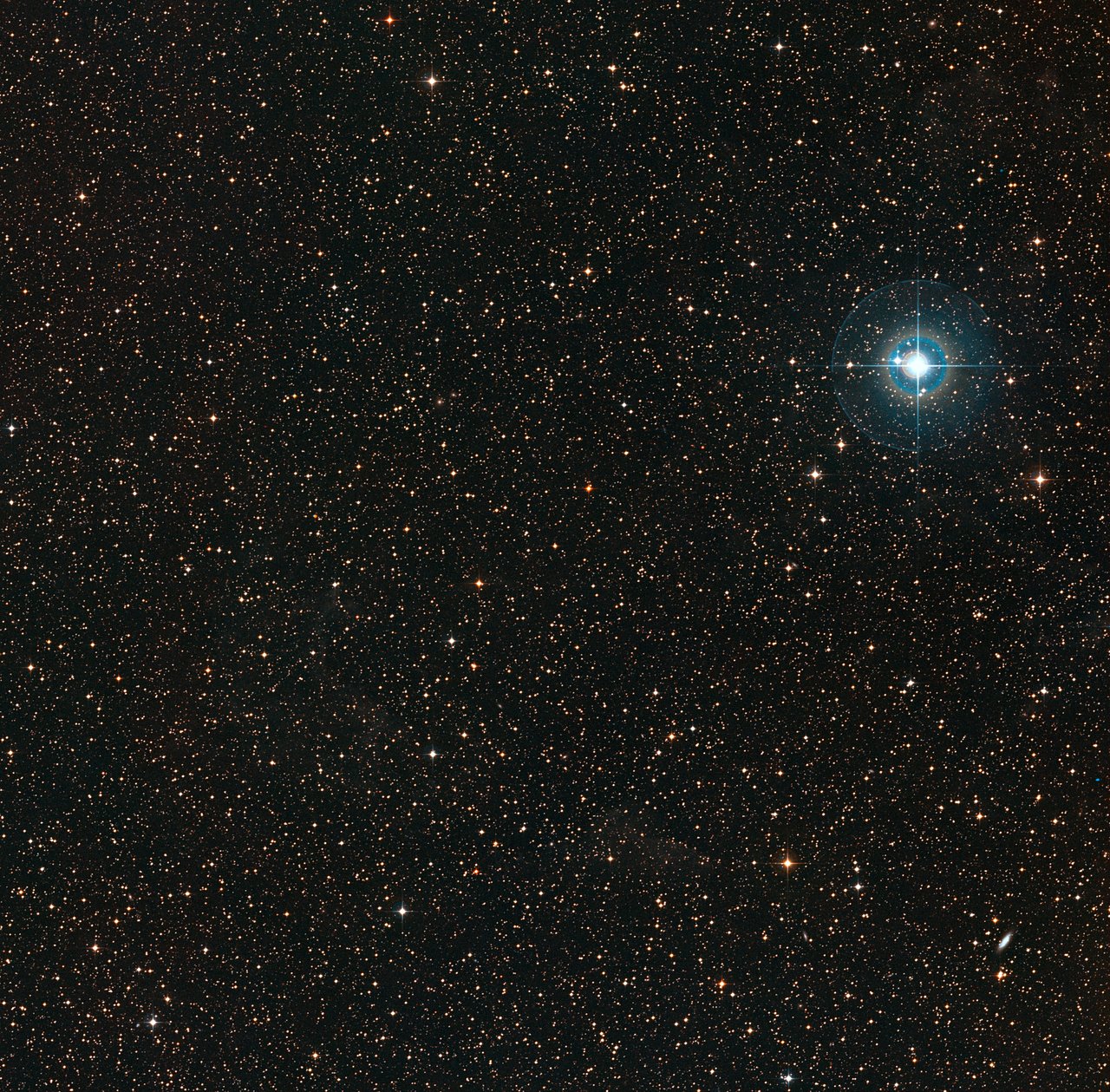 L’immagine a colori mostra il cielo intorno alla debole stella nana Pds 70 di colore aranciato (al centro dell’immagine). La stella blu e brillante in alto a destra è χ Centauri. Crediti: