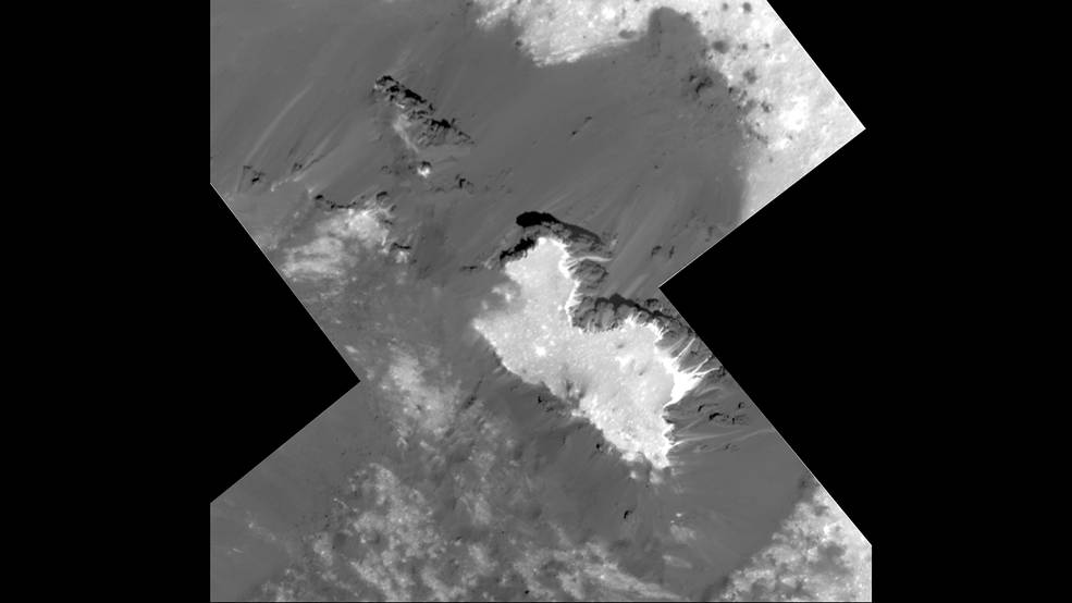 Nell’immagine uno zoom sulla regione Vinalia Faculae nel cratere Occator. Lo scatto è stato ottenuto dalla sonda Dawn della Nasa lo scorso 14 giugno da un’altitudine di circa 39 chilometri. La foto rivela l’intreccio tra materiale brillante e scuro sulla superficie del pianeta nano Cerere. La complessa struttura scura ricorda i flussi di lava osservati sulla Terra. Tuttavia, nel caso di Cerere, il materiale del flusso probabilmente implica la presenza di molto ghiaccio in un lontano passato. Il materiale brillante è composto principalmente da carbonato di sodio, un sale la cui esposizione sul fondo del cratere ha comportato la presenza di una fonte liquida. Crediti: Nasa/Jpl-Caltech/Ucla/Mps/Dlr/Ida