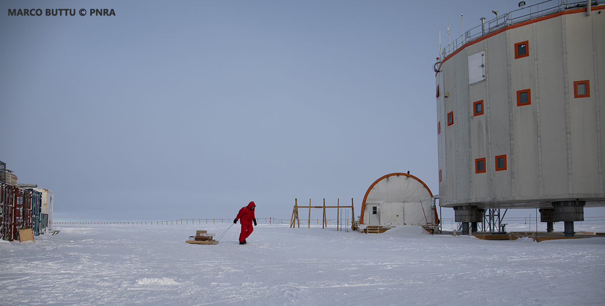 Il cuoco Marco Smerilli intento a trasportare il cibo con uno slittino verso la base. A sinistra si intravedono i container dove sono stoccati i rifornimenti, a qualche decina di metri dell’ingresso principale della base. Crediti: Marco Buttu / Pnra