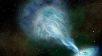 I quasar sono galassie con buchi neri supermassicci nei loro nuclei: buchi neri milioni o miliardi di volte più massicci del Sole. La potente attrazione gravitazionale di simili oggetti risucchia il materiale vicino, che si dispone su un disco rotante loro attorno. Ruotando rapidamente, il disco sputa verso l’esterno getti di particelle in moto a velocità prossime a quella della luce, emettendo luce visibile e onde radio.
