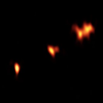 Immagine Vlba del quasar P352-15, ad una distanza di circa 13 miliardi di anni luce dalla Terra. Sono visibili tre componenti principali del quasar, di cui due mostrano ulteriori sottostrutture. Crediti: Momjian et al.; B. Saxton (Nrao/Aui/Nsf)