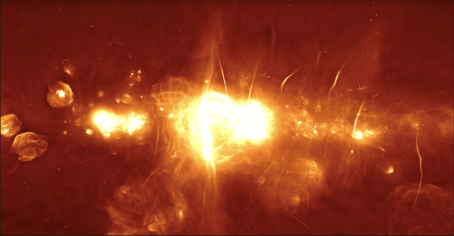 Questa immagine del telescopio MeerKat è considerata la più chiara fotografia del centro della Via Lattea e include caratteristiche mai viste prima, regioni di formazione stellare e filamenti radio. Crediti: Sarao