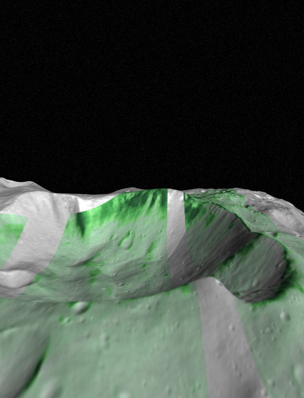 L’olivina, un materiale comune nelle rocce del mantello dei pianeti interni del Sistema solare, è stata individuata su Vesta con l’analisi dei dati iperspettrali raccolti dallo strumento VIR a bordo della sonda Dawn. Nell’immagine, in verde sono indicati gli affioramenti di olivina all’interno del cratere Bellicia. Crediti: immagine generata da Alessandro Frigeri ed Eleonora Ammannito combinando i dati dello spettrometro VIR e le immagini della Framing Camera a bordo di Dawn.