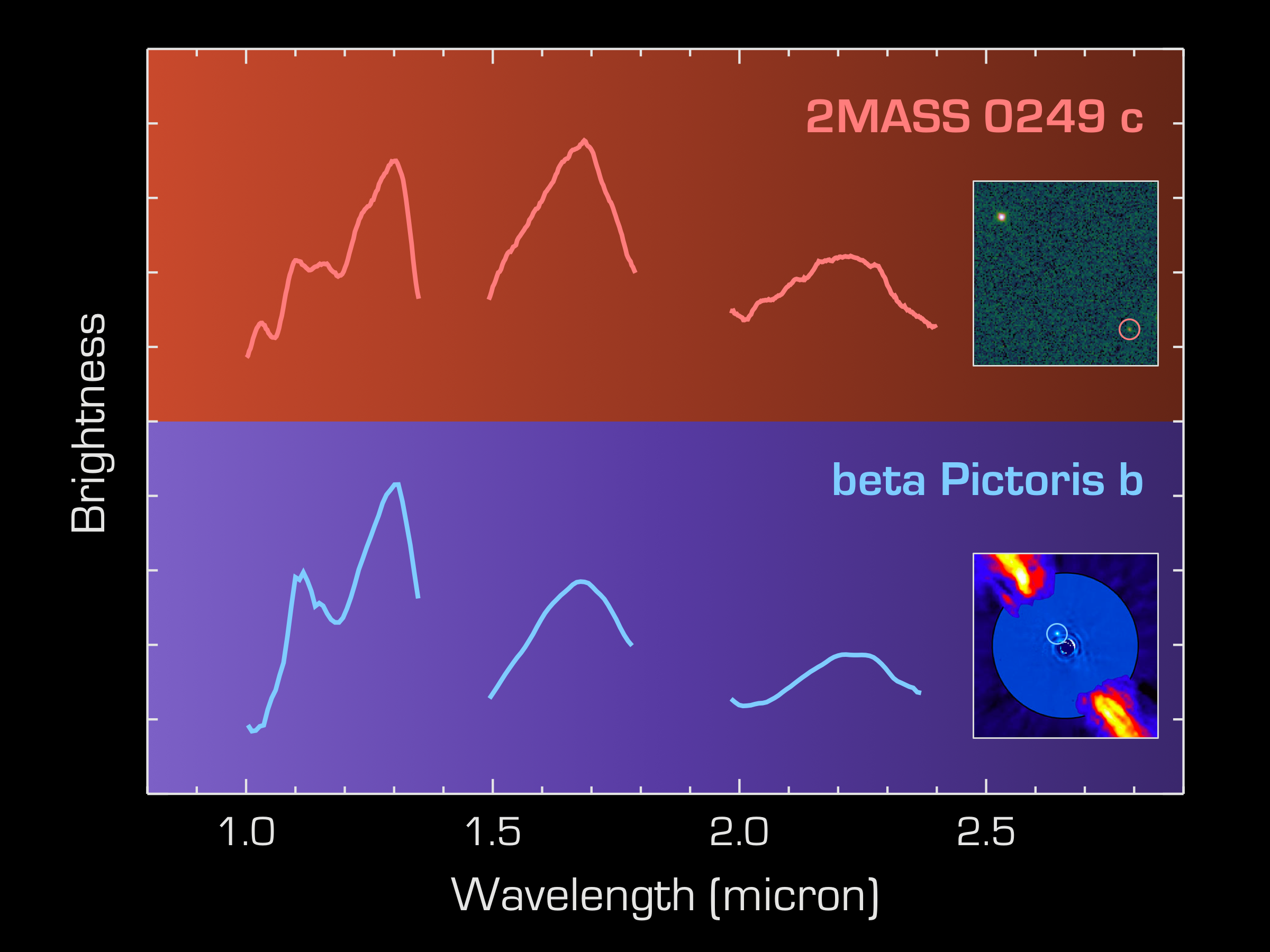 Gli spettri infrarossi di 2Mass 0249c e beta Pictoris b sono simili, come previsto per due oggetti di massa comparabile che si sono formati nella stessa nursery stellare. A differenza di 2Mass 0249c, beta Pictoris b orbita molto più vicino alla sua massiccia stella ospite ed è inserito in un luminoso disco circumstellare. Crediti: T. Dupuy, Eso/A.-M. Lagrange et al.