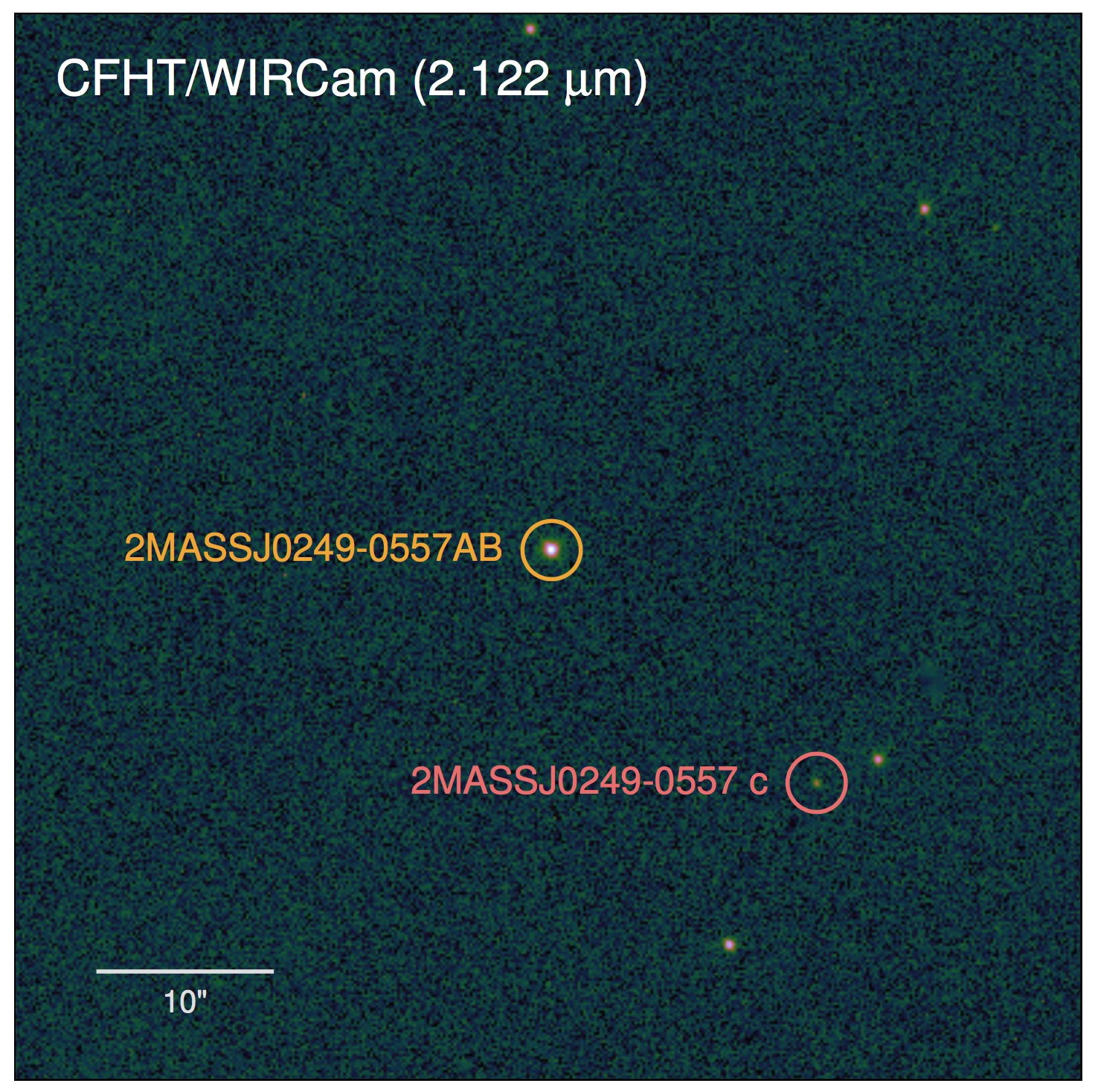 Immagine del sistema 2Mass 0249 ottenuta con la fotocamera a infrarossi Cfht Wircam. 2Mass 0249c si trova a 2000 unità astronomiche dalle nane brune ospiti, che non sono risolte in questa immagine. Crediti: T. Dupuy, M. Liu