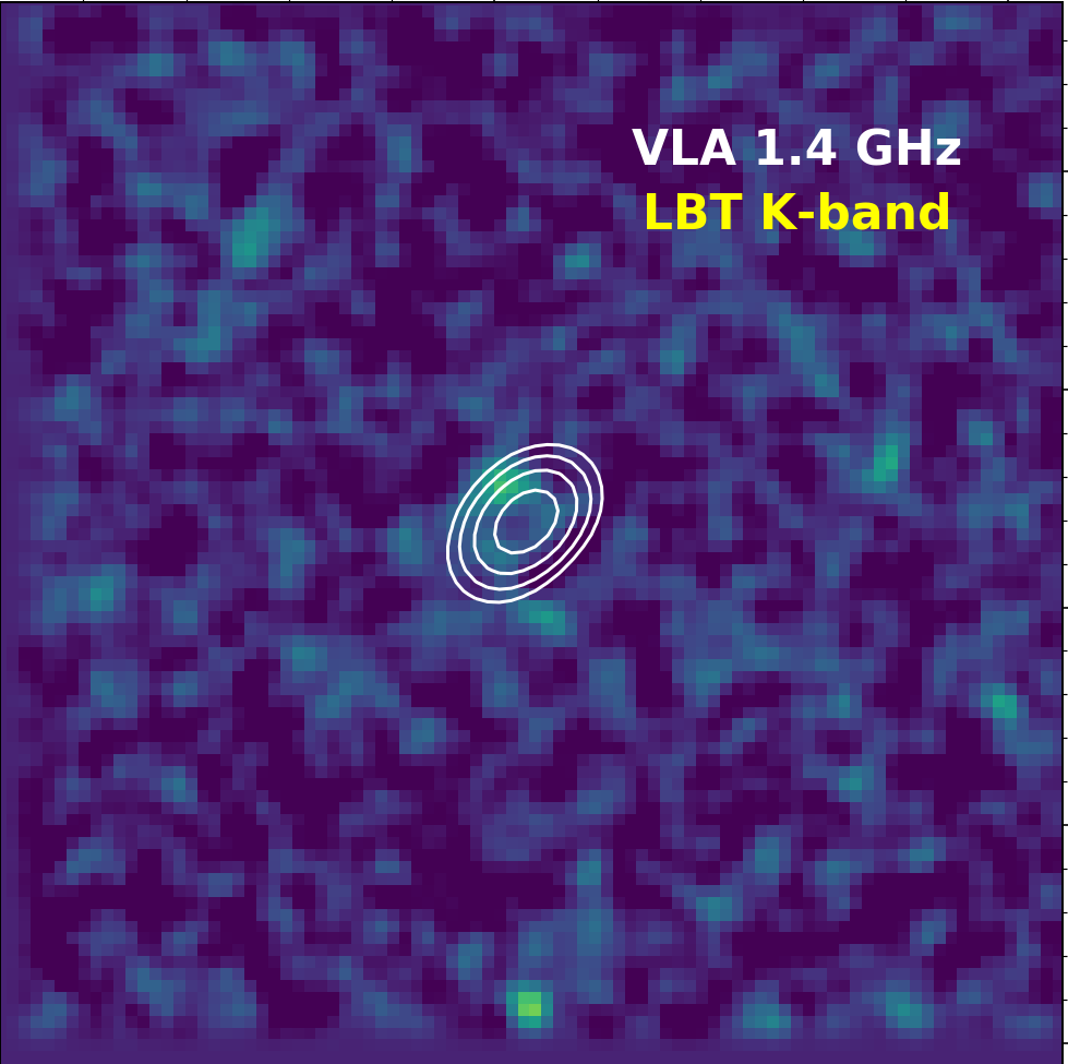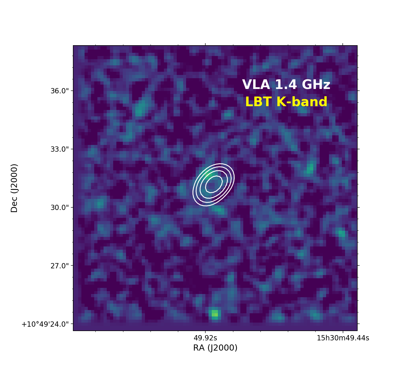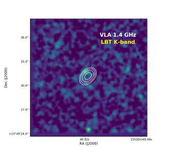 Immagine della radiogalassia nella banda K ottenuta con il Large Binocular Telescope (Lbt). I contorni rappresentano l’emissione Vla a 1,4 GHz (Saxena et al., 2018) della radio sorgente TGSS1530. Crediti: Saxena et al., 2018.