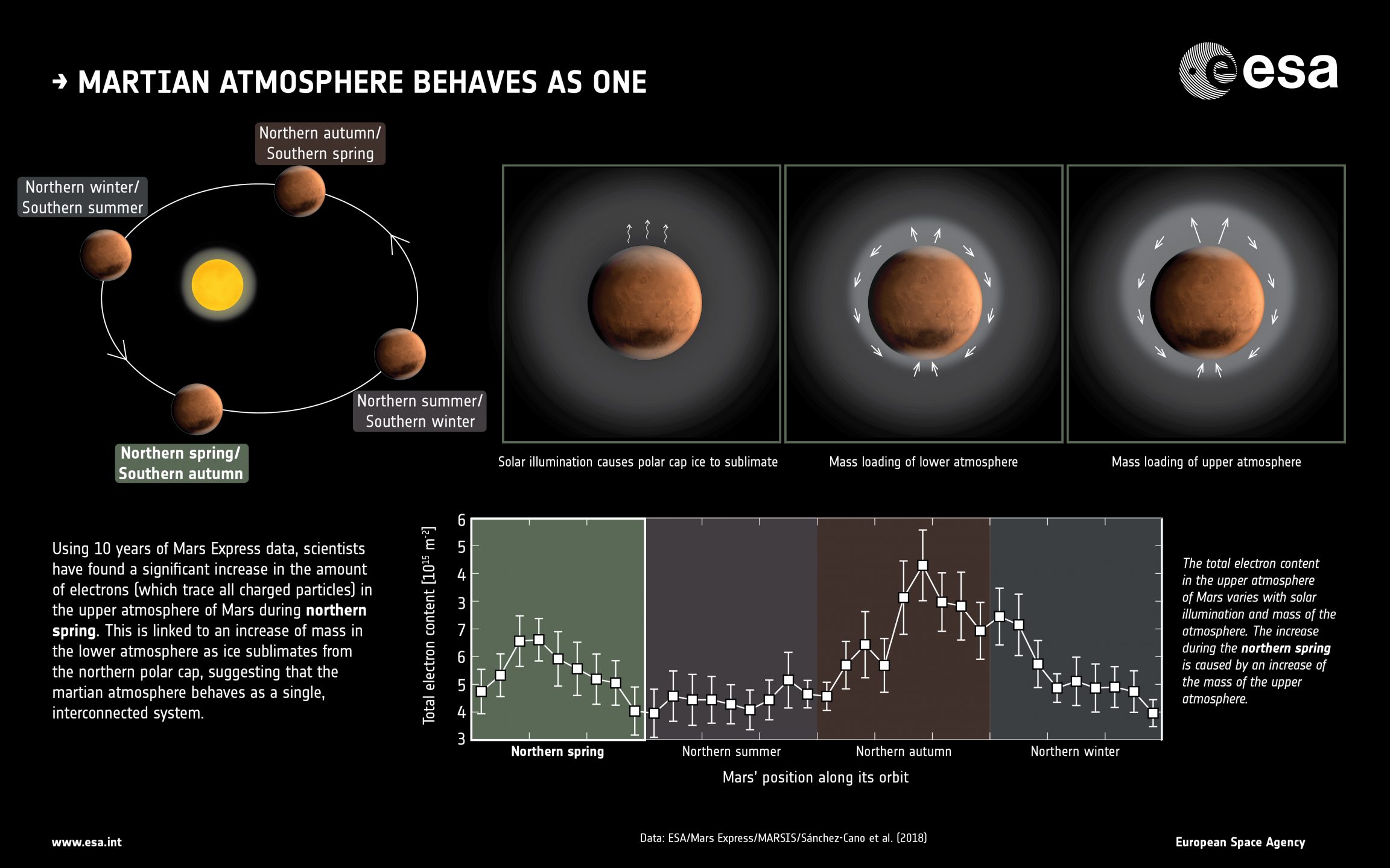 «Abbiamo scoperto un sorprendente e significativo aumento della quantità di particelle cariche nell’alta atmosfera durante la primavera nell’emisfero settentrionale, quando la massa di gas nella bassa atmosfera cresce mano a mano che il ghiaccio sublima dalla calotta polare nordica», spiega Sánchez-Cano.