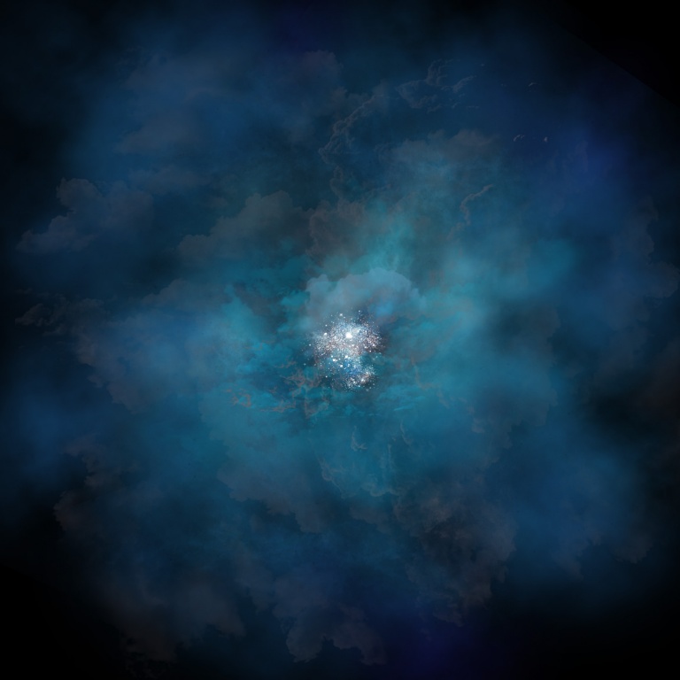 Un’immagine artistica raffigurante l’alone gassoso che circonda una galassia, illuminato da una stretta banda di luce ultravioletta detta emissione Lyman alfa. L’alone di gas di Q2343-BX418 è circa dieci volte più grande della galassia stessa. Crediti: T. Klein, Uwm