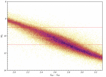 Porzione del diagramma H-R delle stelle della Dr2 entro 100 parsec, nella quale è evidente il sottile gap che attraversa la sequenza principale a magnitudine circa 10. Crediti: The American Astronomical Society/ESA/Gaia/DPAC/Georgia State University
