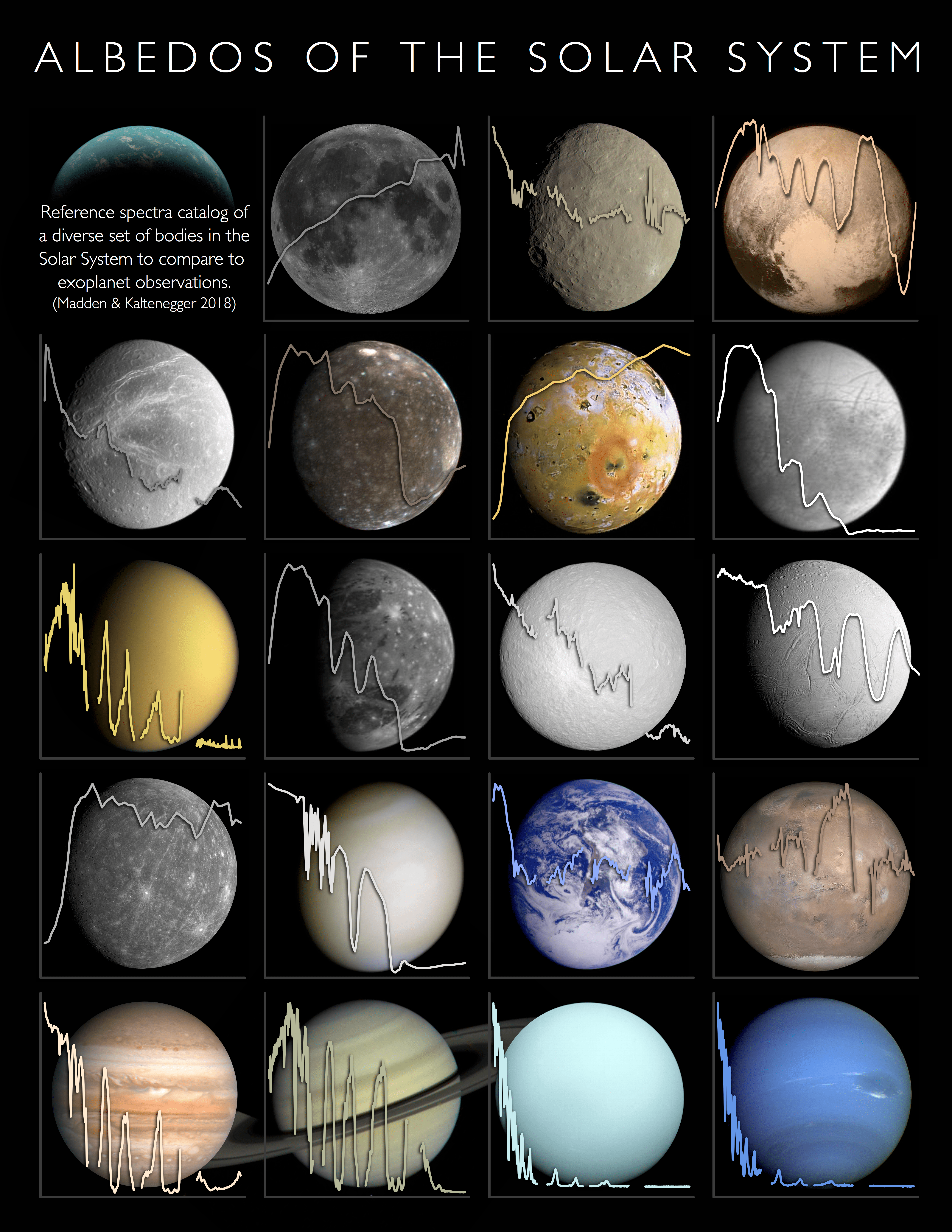 Lisa Kaltenegger, professoressa associata di astronomia alla Cornell University e direttrice del Carl Sagan Institute, e Jack Madden, doctoral candidate al Carl Sagan Institute e alla Cornell University, hanno creato un catalogo di riferimento, utilizzando spettri calibrati e albedo geometriche (la luce riflessa da una superficie) di 19 corpi del nostro Sistema solare: gli otto pianeti, nove lune – dalle ghiacciate alle ricoperte di lava- e due pianeti nani, Cerere nella fascia degli asteroidi e Plutone da quella di Kuiper.