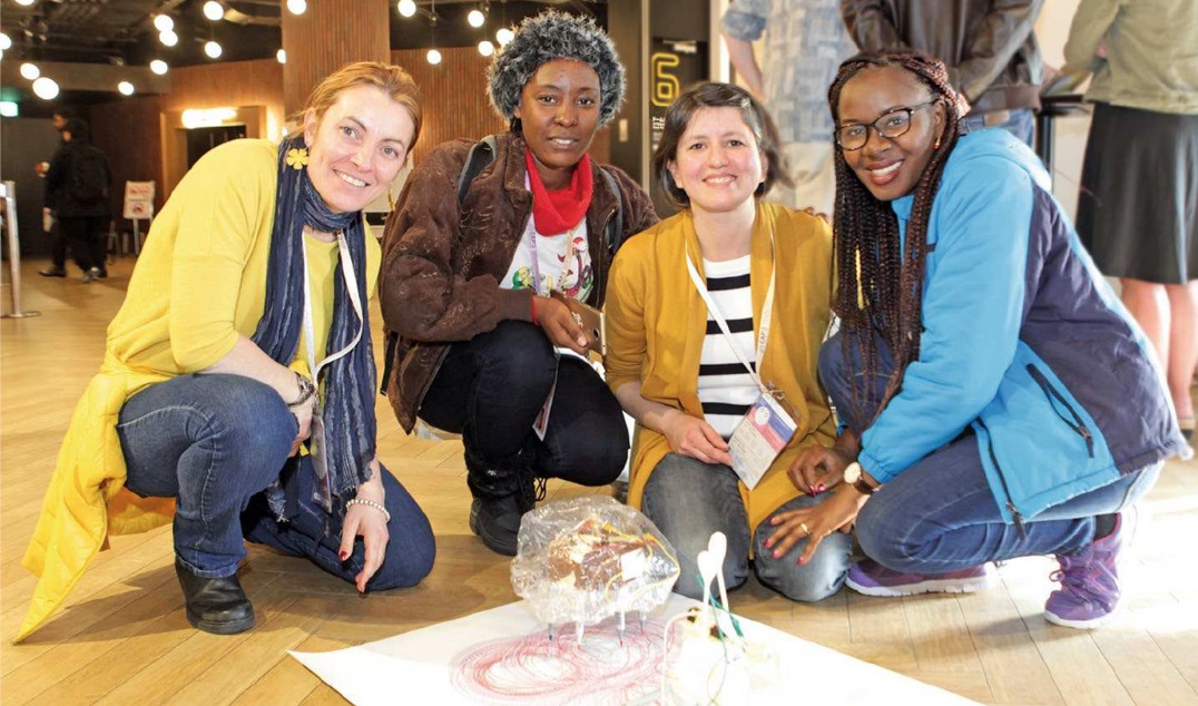 Sara Ricciardi (terza da sinistra) con tre partecipanti al Cap 2018 di Fukuoka attorno a una “scribbling machine” (una macchina per scarabocchiare) realizzata durante il workshop. Fonte: Nature Astronomy, vol. 2, July 2018. Crediti: CAP2018 Local Organizing Committee