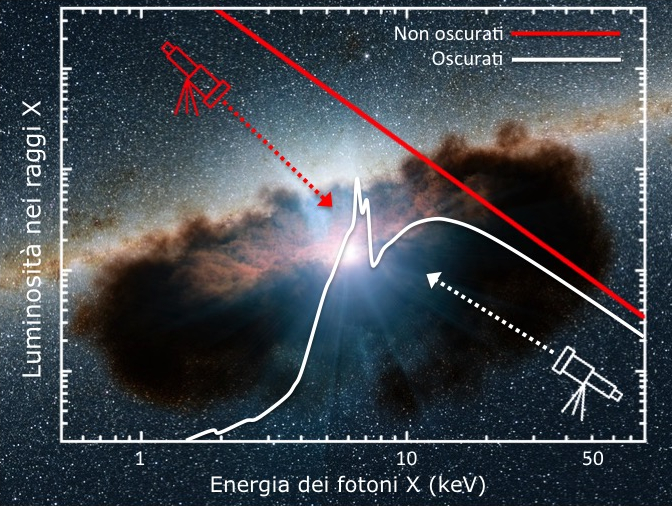 Rappresentazione schematica del modo in cui viene visto nei raggi X uno spettro di un AGN oscurato (è il caso della Hot DOG) e di un AGN non oscurato a seconda del punto in cui passa la linea di vista: rispettivamente, attraverso il toro di gas e polvere che assorbe i raggi X per effetto fotoelettrico fino a energie di 10 keV e oltre (linea continua), oppure lungo una linea di vista non oscurata, vale a dire attraverso il buco della ciambella del toro che circonda la sorgente X centrale (linea tratteggiata). Crediti: NASA/JPL-Caltech, Luca Zappacosta