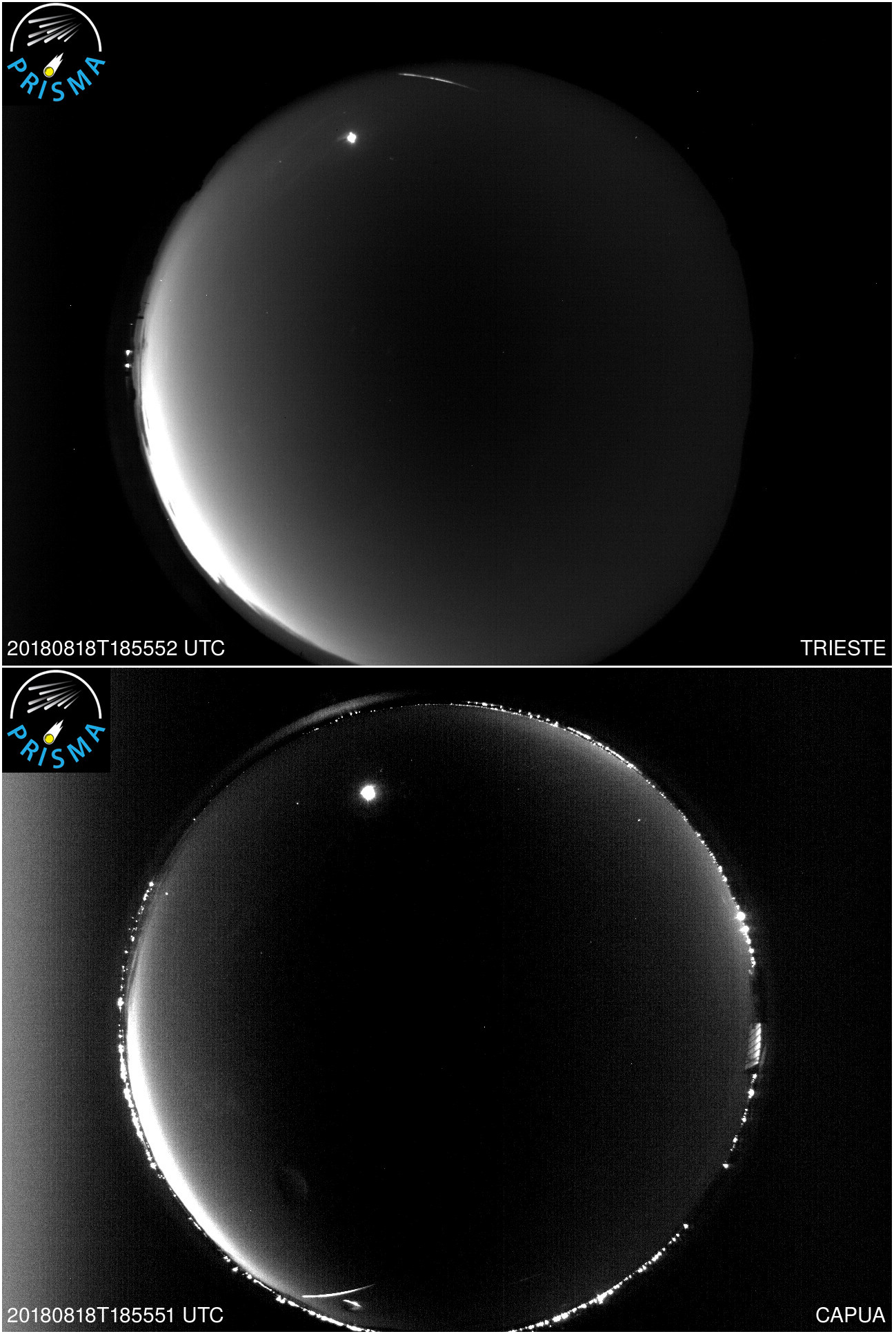 Le due immagini del bolide riprese dalle stazioni Prisma di Trieste (in alto) e di Capua (in basso). Crediti: Progetto Prisma