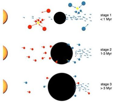 Questa immagine mostra la formazione di Giove in tre fasi. Fase 1, fino a 1 milione di anni: Giove acquista massa per accrescimento di piccoli ciottoli (punti blu) che ne hanno formato il nucleo. I planetesimi primordiali (grandi punti rossi) mostrano le alte velocità di collisione (frecce rosse) che portano a scontri distruttivi (giallo) e producono piccoli planetesimi di seconda generazione (piccoli punti rossi). Stadio 2, 1-3 milioni di anni: l’energia risultante dall’accrescimento dei piccoli planetesimi impedisce un rapido accumulo di gas e quindi una rapida crescita (frecce grigie). Fase 3, oltre 3 milioni di anni: Giove è formato a sufficienza da accumulare grandi quantità di gas. Crediti: UniBE