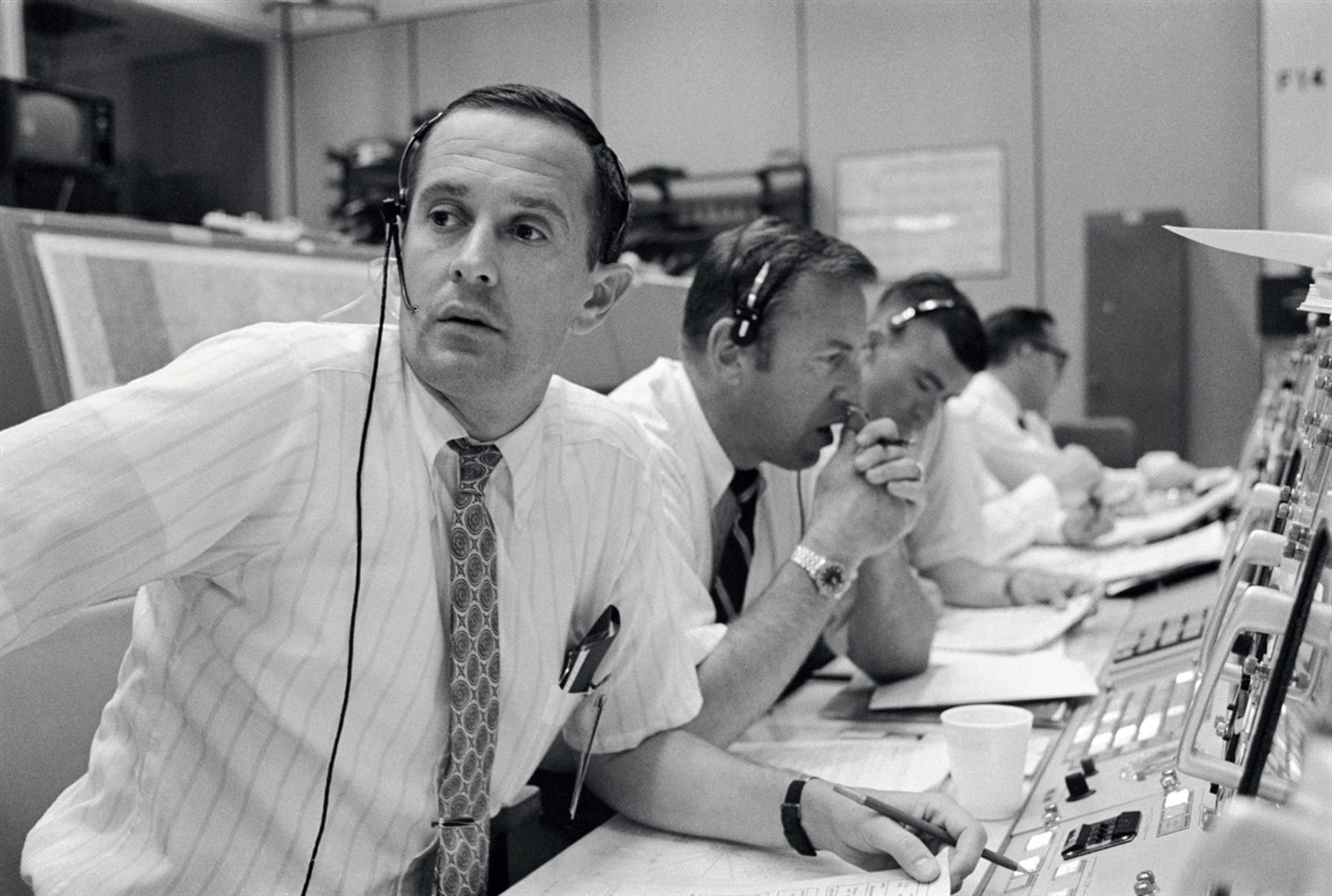 Gli astronauti Charles Duke Jr., James Lovell Jr. e Fred Haise Jr. nella sala di controllo, intenti a tenere i contatti con i colleghi a bordo dell’Apollo 11 durante lo storico atterraggio sulla Luna del 20 luglio 1969. Crediti: Nasa
