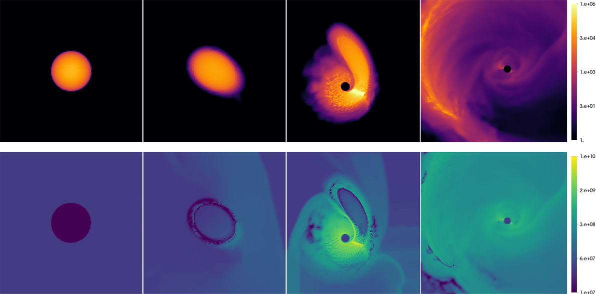 Simulazione al computer di una nana bianca che viene distrutta da un buco nero di massa pari a mille masse solari. Crediti: P. Anninos, P. C. Fragile et al. (2018)