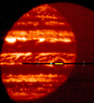 La Grande macchia rossa si trova in corrispondenza dell segno nero al centro di questa immagine a infrarossi di Giove. È scura a causa delle nuvole spesse che bloccano le radiazioni termiche. La striscia gialla denota la porzione dell’area presa in considerazione dall’analisi di Bjoraker. Crediti: Nasa’s Goddard Space Flight Center/Gordon Bjoraker