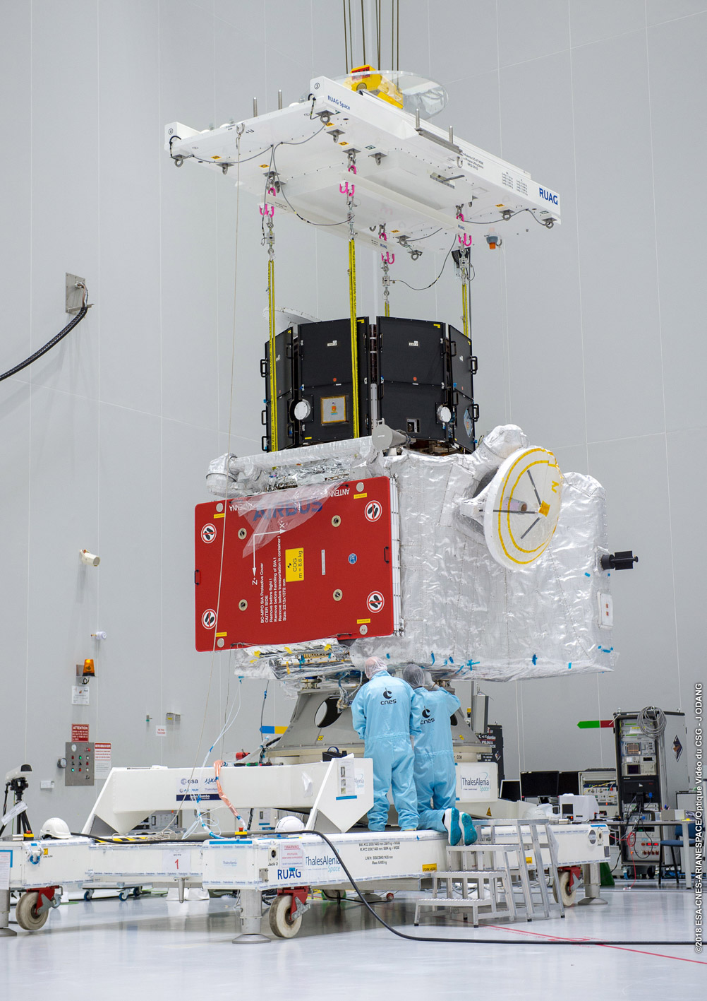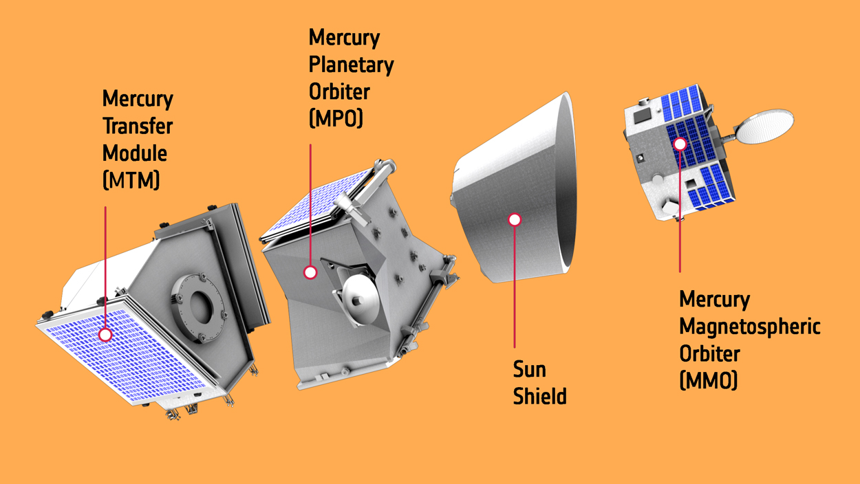 Uno è dell’agenzia spaziale giapponese Jaxa, si chiama Mmo (Mercury Magnetospheric Orbiter) e avrà il compito di studiare in dettaglio l’ambiente magnetico di Mercurio, l’interazione del pianeta con il vento solare e la chimica della sua impalpabile esosfera. L’altro è dell’Esa, l’Agenzia spaziale europea, si chiama Mpo (Mercury Planetary Orbiter) ed è quello della coppia che più si avvicinerà a Mercurio, per analizzarne la superficie e la composizione. Sono i due orbiter della missione BepiColombo: è al loro interno che si trovano tutti gli strumenti scientifici, e finalmente – superata con successo l’ultima revisione, la qualification acceptance review – i tecnici dell’Esa hanno potuto impilarli l’uno sull’altro nella configurazione di volo: quella che manterranno per l’intera durata del viaggio, dal momento del lancio fino a quello della separazione, in programma fra sette anni, per poi procedere ciascuno per conto proprio in orbita attorno al pianeta più interno del Sistema solare.