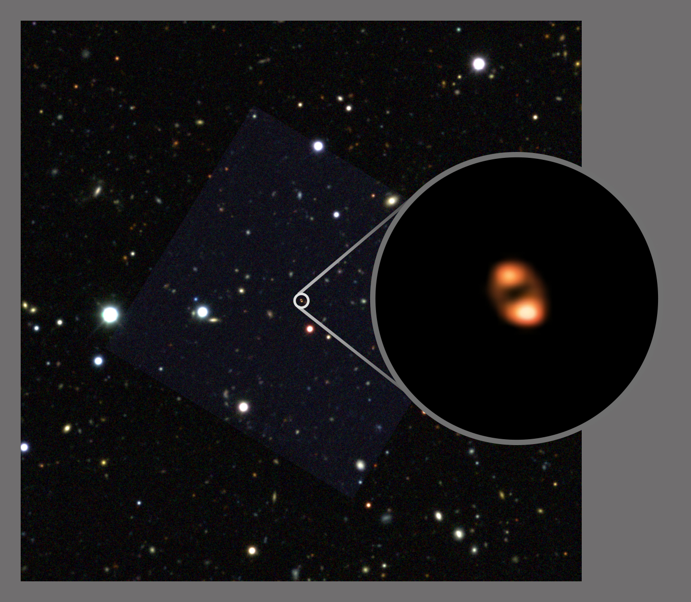 Alma, anche grazie alla presenza di una lente gravitazionale, ha catturato l’immagine di un outflow di una galassia vista quando l’universo aveva solo un miliardo di anni. L’immagine di ALMA (ingrandita nel riquadro circolare) mostra la posizione delle molecole di idrossile (OH), che tracciano la posizione del gas che forma una stella mentre fugge dalla galassia, probabilmente guidato da una supernova o da un “vento” alimentato da un buco nero. Il campo stellare sullo sfondo (Blanco Telescope Dark Energy Survey) mostra la posizione della galassia. La forma circolare a doppio lobo della galassia lontana è dovuta alla distorsione causata dall’effetto di ingrandimento della galassia interposta. Credit: ALMA (ESO/NAOJ/NRAO), Spilker; NRAO/AUI/NSF, S. Dagnello; AURA/NSF