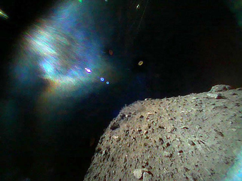 Foto a colori scattata dal Rover-1B alle 6:07 ora italiana di venerdì 21 settembre, immediatamente dopo la separazione dalla sonda madre Hayabusa-2. La superficie di Ryugu è in basso a destra. La chiazza colorata in alto a sinistra è dovuta al riflesso della luce solare. Crediti: Jaxa