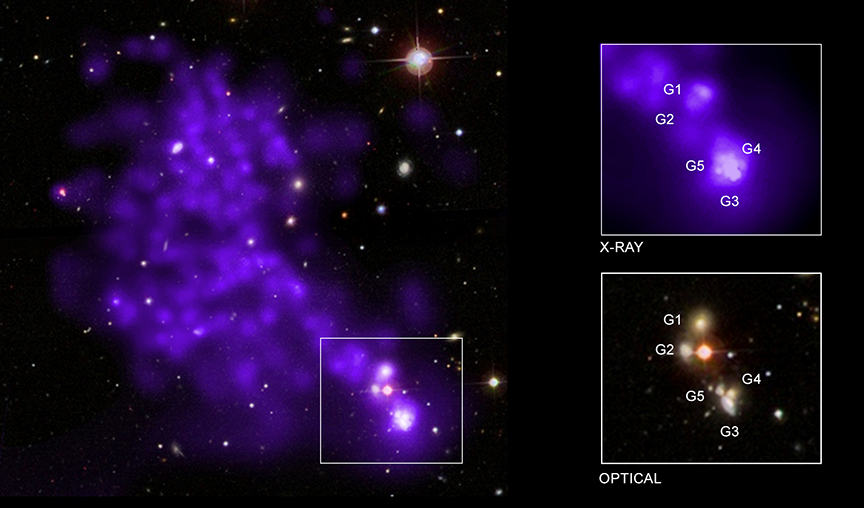 Nei riquadri a dx è mostrato un’ingrandimento delle quattro galassie brillanti (contrassegnate G1, G3, G4 e G5) in raggi X (sopra) e in ottico (sotto). La galassia G2 non fa parte del gruppo ma è un oggetto di sfondo.