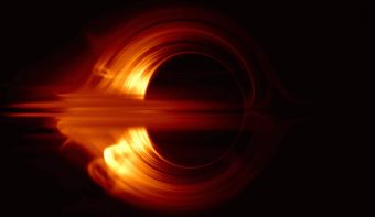 L’immagine illustra una simulazione numerica tridimensionale relativa al moto del gas magnetizzato che ruota attorno a Sagittarius A* emettendo onde radio in banda millimetrica, generata mediante il programma Raptor, sviluppato presso l’Università di Radboud. Si nota come viene piegata e assorbita la luce dal buco nero. Crediti: T. Bronzwaer, J. Davelaar, M. Moscibrodzka e H. Falcke/Radboud University