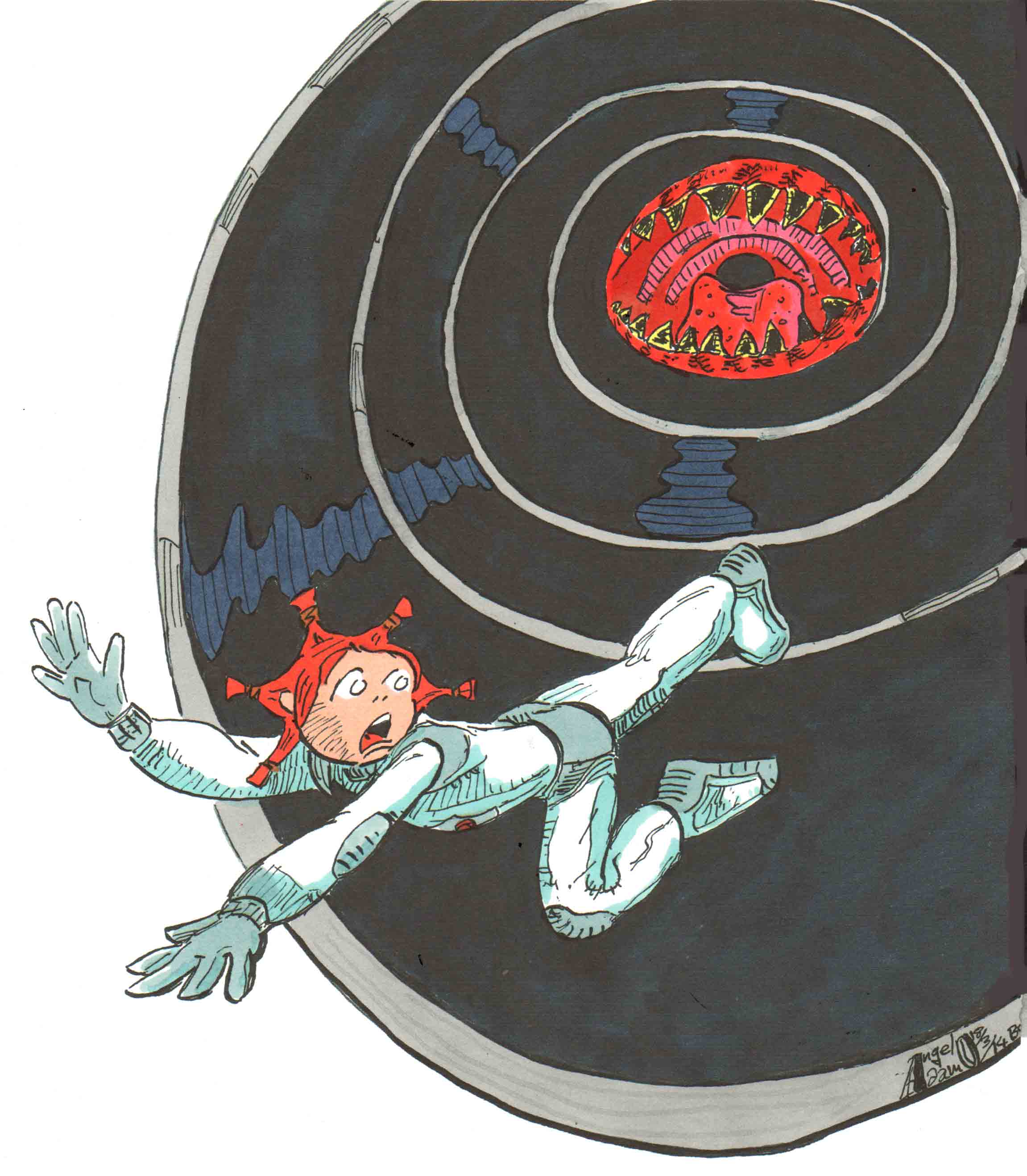 Martina tremenda sfugge al Buco Nero. Illustrazione di Angelo Adamo tratta dal libro “Astrokids” di Stefano Sandrelli e Laura Daricello (Scienza Express, 2014)