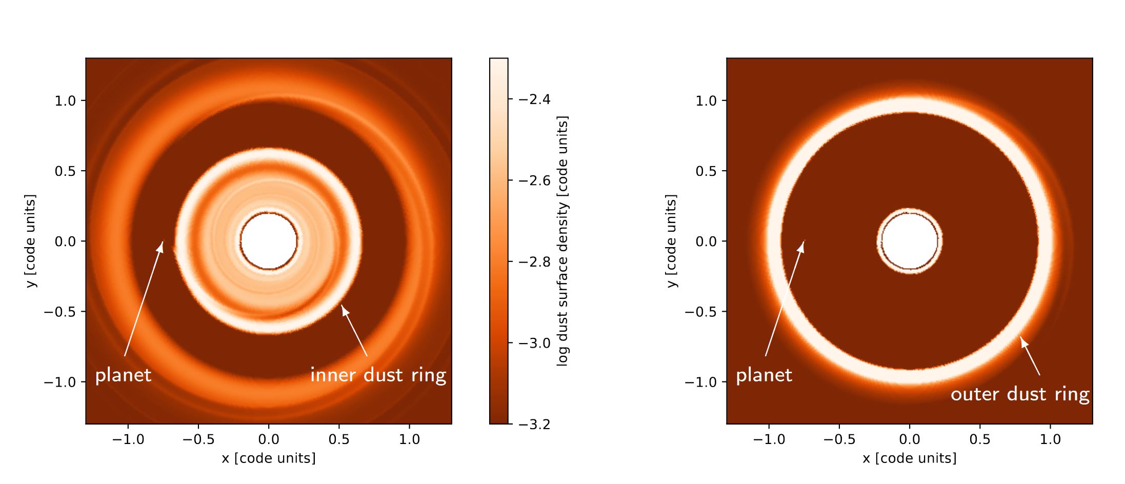 In secondo luogo, l’anello interno è costituito da particelle più piccole perché queste si muovono verso l’interno più lentamente rispetto al pianeta. Di conseguenza non sono in grado di uscire dalla scia del pianeta che si muove verso l’interno e quindi si accumulano in un anello appena all’interno del pianeta stesso.