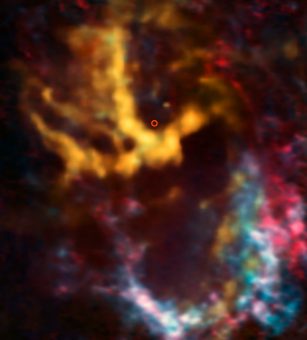Questa immagine di Alma, l’Atacama Large Millimeter/submillimeter Array, mostra l’area circostante a Sagittarius A*, il buco nero supermassiccio che si annida al centro della Via Lattea – evidenziato qui con un piccolo cerchio. Una nuova ricerca ha rivelato prove entusiasmanti di gas interstellare e polvere in orbita attorno al buco nero ad alta velocità.