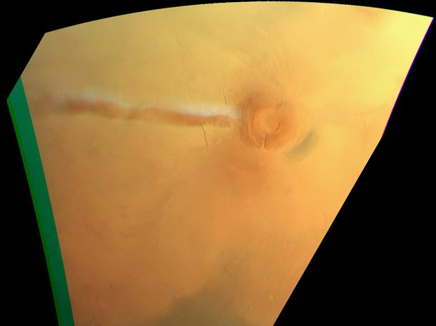 A partire dal 13 settembre, il satellite Mars Express dell’Esa ha osservato l’evoluzione di una strana nube allungata, che si estende per 1500 chilometri verso ovest parallelamente all’equatore, proprio in prossimità del gigantesco vulcano Arsia Mons.