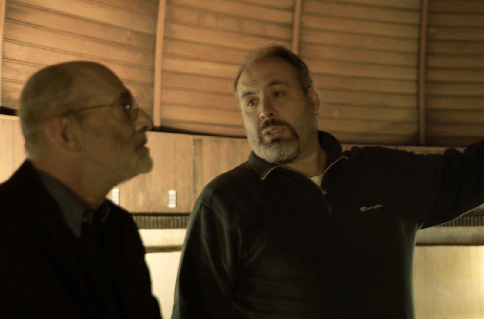 Un fotogramma del film dentro la cupola dell’Osservatorio di Campo Imperatore. A sinistra, il regista Felice Farina. A destra, Andrea Di Paola, ricercatore dell’Istituto nazionale di astrofisica