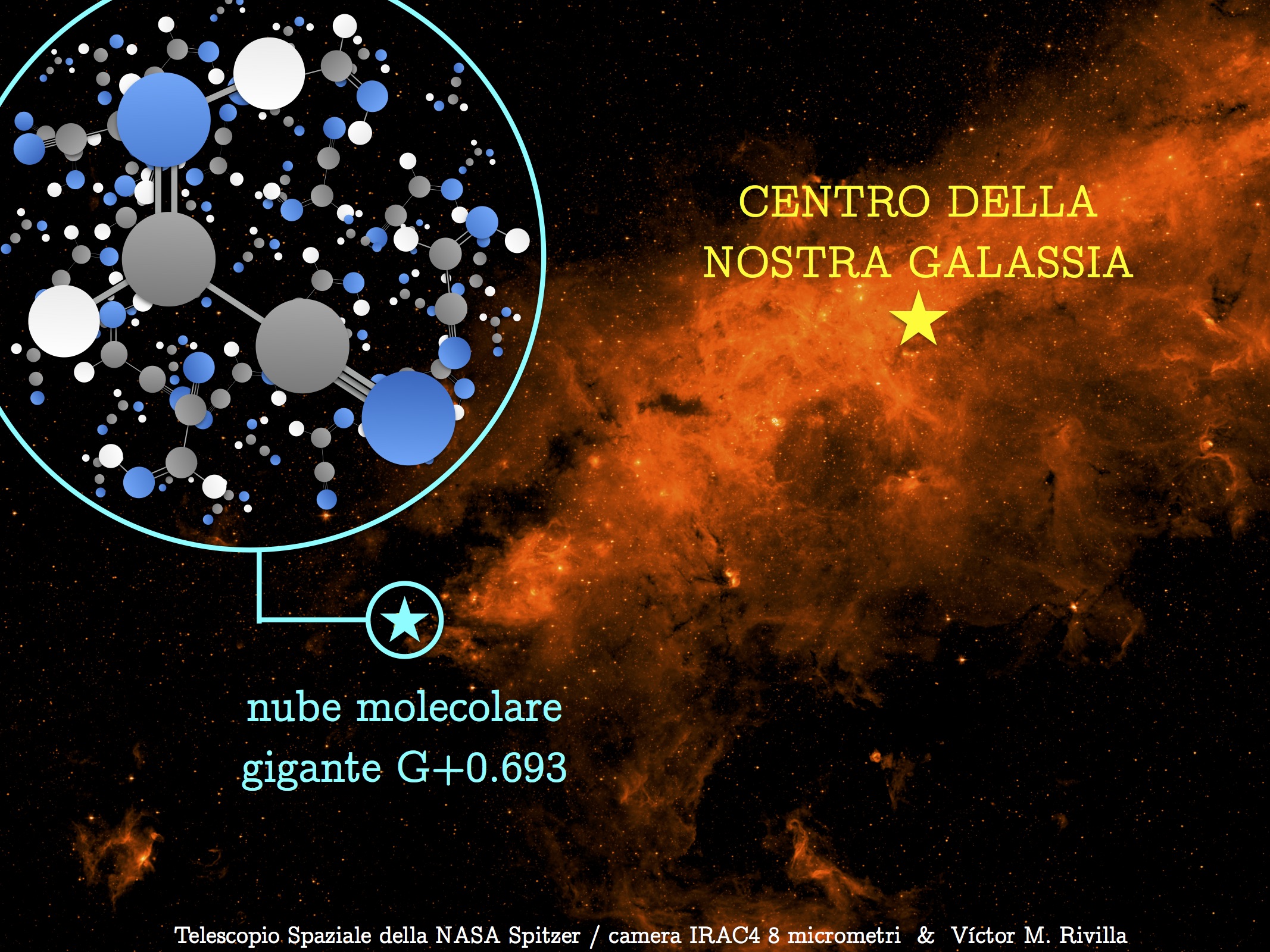 L’immagine di fondo della zona del centro della nostra galassia è stata presa col telescopio spaziale della Nasa Spitzer, in particolare con la camera Irac (Infrared Array Camera) osservando a 8 microns. La stella gialla indica la posizione del centro galattico e la stella celeste corrisponde alla posizione della sorgente che è stata studiata, la nube molecolare gigante G+0.693. In questa regione è stata rilevata per prima volta la molecola Z-HNCHCN, in quantità relativamente alte. Questo risultato è importante perché ci dice che molecole che si considerano precursori della adenina si possono formare efficientemente nel mezzo interstellare, aprendo certamente la possibilità della formazione di molecole più complesse come appunto la adenina, che è uno dei componenti fondamentali delle catene di rna e dna. Crediti: Nasa Spitzer Space Telescope, camera Irac 4-8 microns, Víctor M. Rivilla (Inaf Arcetri)