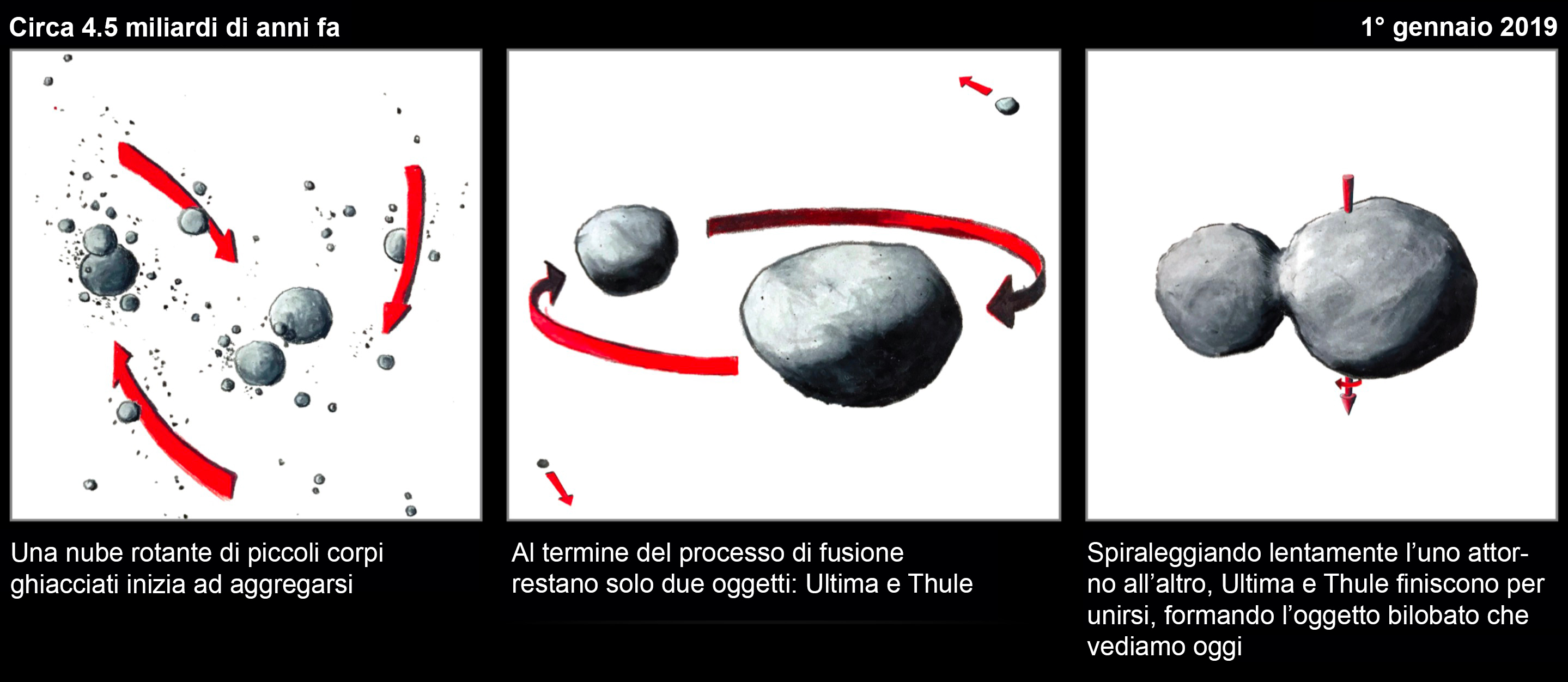 Il processo di formazione ipotizzatoper Ultima Thule. Crediti: Nasa / JhuApl / Swri / James Tuttle Keane (trad. it. di Media Inaf)
