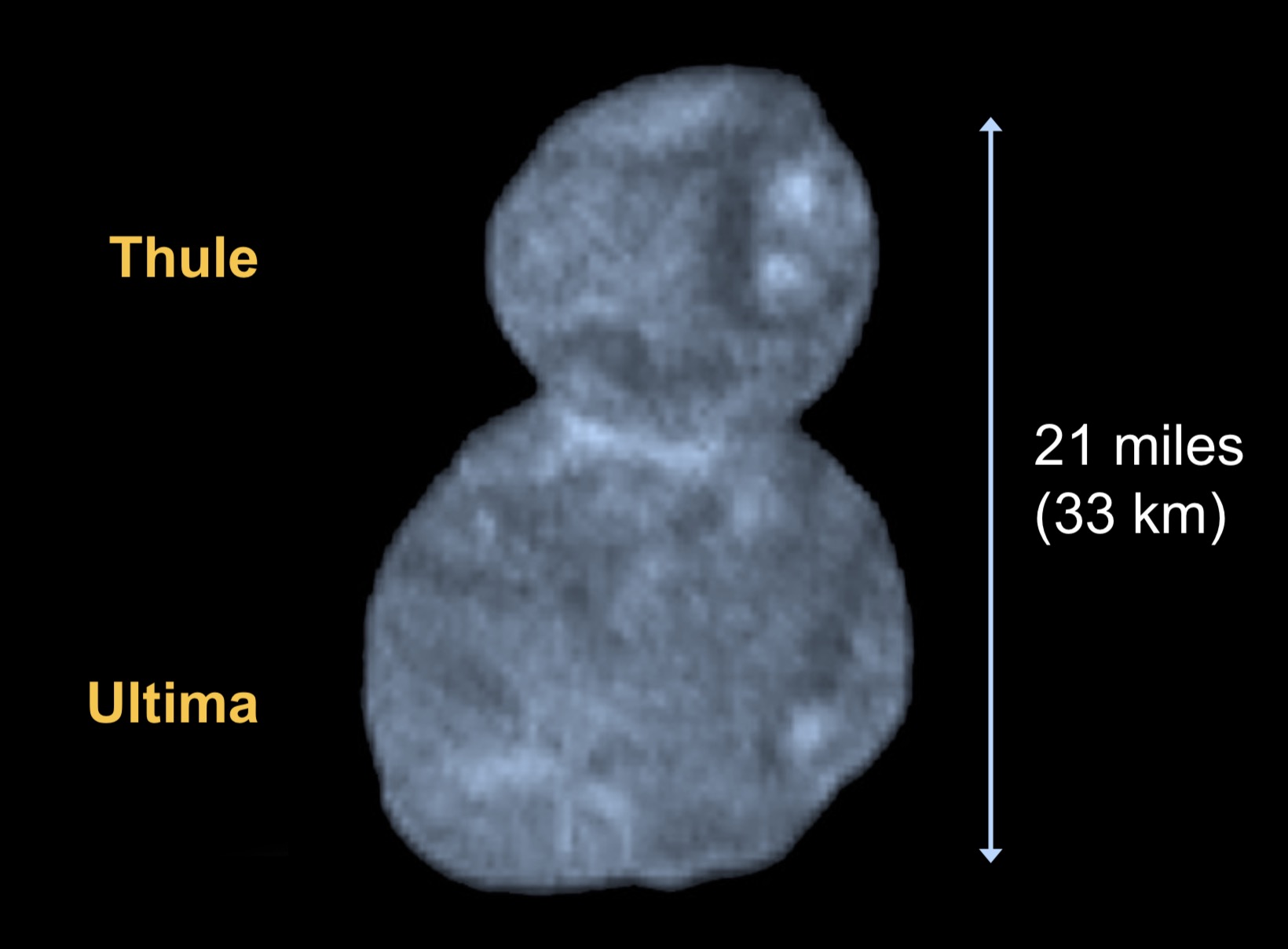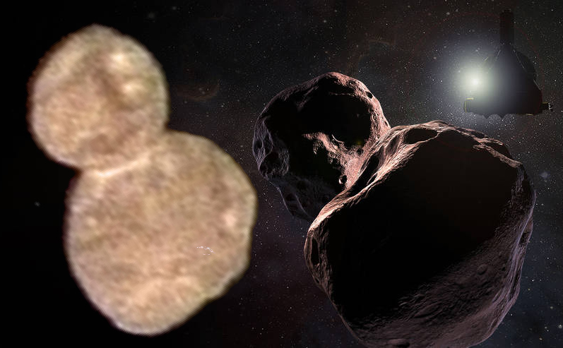 Guardiamola, dunque, questa fotografia scattata da 27mila km di distanza alle 6:01 ora italiana del primo giorno dell’anno. La prima cosa che sorprende, naturalmente, è la silhouette: a pupazzo di neve secondo alcuni, a scamorza secondo altri (qui potete esprimere il vostro voto). È ciò che gli scienziati chiamano una contact binary, una forma bilobata: due sfere irregolari saldate fra loro – 14 km di diametro la più piccola, 19 km la più grande – a formare un corpo – la scamorza, appunto – lungo in tutto 33 km. La “saldatura”, dicono i ricercatori, risale a quando il Sistema solare aveva appena un centesimo dell’età attuale, agli albori della sua formazione, circa 4.5 miliardi di anni fa. È il prodotto della collisione fra due corpi sferoidali scontratisi l’un l’altro a bassa velocità – grosso modo quella di un lieve tamponamento fra due auto. Una forma sorprendente, dicevamo, ma certo non inedita: basti pensare alla cometa 67P, quella visitata dalla missione Rosetta.