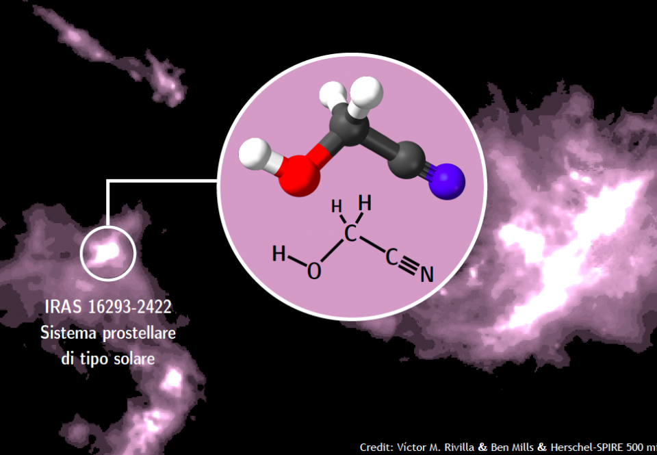 La protostella in prossimità della quale è stato individuato il glicolonitrile si trova a 450 anni luce dalla Terra in direzione della costellazione di Ofiuco, all’interno della regione denominata Rho Ophiuchi, ricca di giovani stelle circondate da un bozzolo di polvere e gas nelle prime fasi della loro evoluzione, condizioni simili a quelle in cui si formò il nostro Sistema solare.