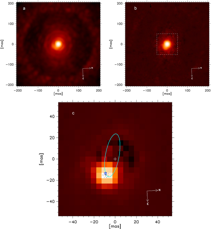 Riquadro A (in alto a sx): prima ricostruzione dell’immagine di Alpha Andromedae dopo la correzione delle micro-vibrazioni residue. Riquadro B (in alto a dx): seconda ricostruzione dell’immagine dopo la rimozione dei residui della turbolenza atmosferica. Riquadro C (n basso): ingrandimento che mostra la misura della posizione dopo la sottrazione della stella primaria (croce bianca). Il centro della stella secondaria (croce nera nel cerchio tratteggiato) è compatibile con la posizione prevista (quadratino blu) lungo l’orbita (ellisse in celeste). Crediti: Rnaas / M. Mattioli et al., 2019
