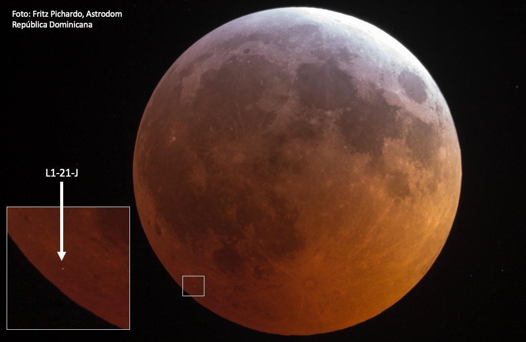 La posizione esatta dell’impatto del meteoroide sulla superficie lunare (punto rosso), determinata dal gruppo di astronomi e astrofili domenicani e colombiani