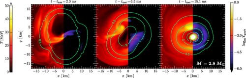 Istantanee sul piano equatoriale di tre momenti rappresentativi dell’evoluzione del sistema binario di massa ridotta. Per ogni istantanea, la parte sinistra del pannello riporta la temperatura mentre la parte destra riporta la frazione di quark. Le linee verdi mostrano i contorni di iso-densità di barioni in unità della densità di saturazione nucleare. Da notare che una transizione di fase avviene solo poco prima che la stella di neutroni collassi in un buco nero (vedi pannello a destra). Crediti: Physical Review Letters