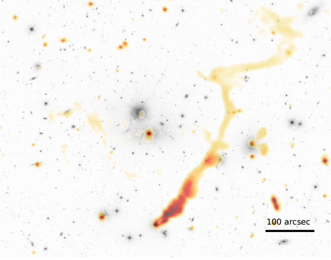 L’ammasso di galassie Abell 1314 si trova nella costellazione dell’Orsa Maggiore a una distanza di circa 460 milioni di anni luce dalla Terra. L’oggetto ospita emissioni radio su larga scala che sono state causate dalla sua fusione con un altro cluster. Le emissioni radio non termiche rilevate con il telescopio Lofar sono mostrate in rosso e rosa, e l’emissione termica dei raggi X rilevata con il telescopio Chandra è mostrata in grigio, sovrapposta a un’immagine ottica. Crediti: Amanda Wilber/Lofar Surveys Team