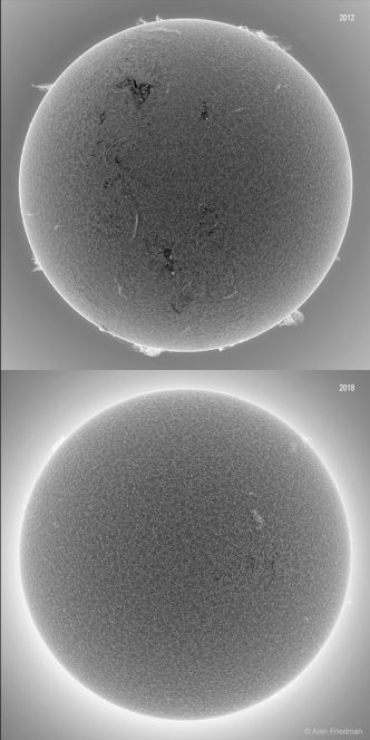 L’Astronomy Picture of the Day di ieri, 6 marzo 2019, proposta dalla Nasa mostra due immagini del Sole prese a sei anni di distanza. Le potete vedere qui a fianco: quella nel riquadro in alto è del 2012, quella nel riquadro in basso è dell’agosto del 2018. Si nota molto bene la differenza tra una fase calda e turbolenta, ricca di macchie solari, e una più tiepida e stabile, in cui le macchie spariscono completamente a favore di un aspetto omogeneo della superficie. Il motivo di queste differenze si chiama ciclo solare: un fenomeno che, nell’arco di circa 11 anni (ma è un lasso di tempo piuttosto variabile) alterna picchi di attività molto intensi, il “massimo solare”, a momenti di relativa calma, il “minimo solare”. Ora il Sole si trova proprio in quest’ultima fase, infatti le macchie sono sparite.