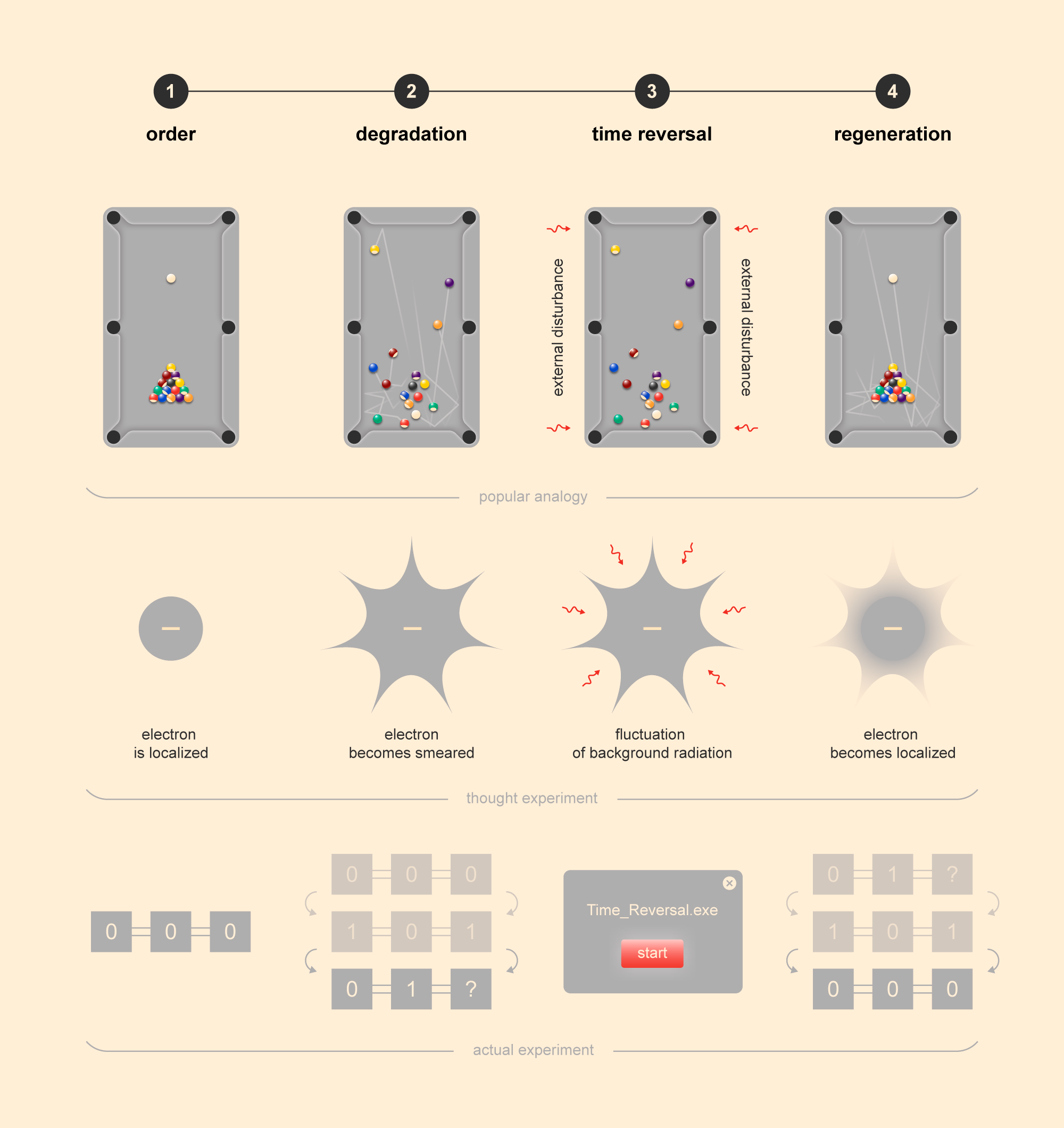 Le quattro fasi dell’effettivo esperimento su un computer quantistico rispecchiano le fasi della ipotetica osservazione di un elettrone libero nello spazio, in analogia con il movimento delle palle da biliardo. Ciascuno dei tre sistemi evolve inizialmente dall’ordine verso il caos, ma poi un disturbo esterno perfettamente temporizzato inverte questo processo. Crediti: @tsarcyanide/Mipt Press Office
