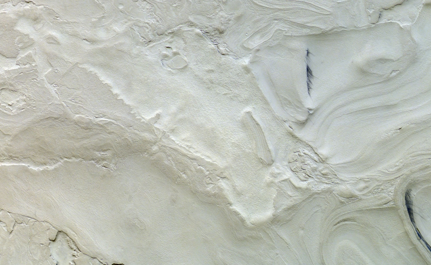 Dallo scatto si ha l’impressione che queste strisce di materiale scorrano in discesa. In passato è stato ipotizzato che questo materiale contenga ghiaccio, ma non ci sono ancora abbastanza prove a riguardo. Dall’immagine (in alto), è evidente anche l’erosione della polvere sotto forma di strisce scure.